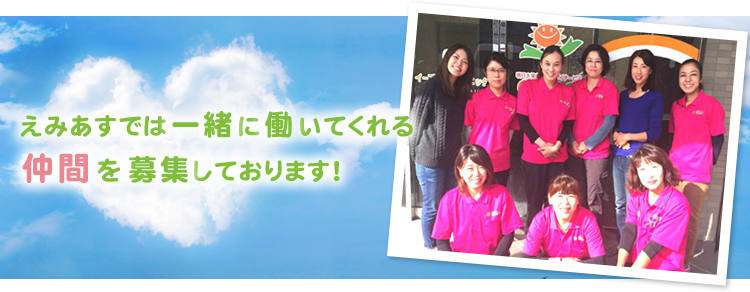 健康状態のチェック/日常生活全般の補助サポート/服薬、医療機器の管理/ターミナル、認知症のケア ▼「えみあす」のポイント 2014年5月に開設した訪問看護ステーションです。立ち上げから現在まで入職したスタッフはほとんど訪問看護未経験でみなさん活躍中です!平均年齢セラピスト20代後半、ナースは30代でほぼ全員が子育て中のママさんです。遅出・早帰りの時間帯などもご相談に応じます。ご興味ある方はお気軽にお問い合わせ下さい♪ |